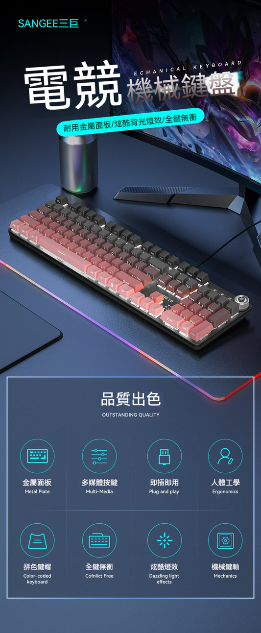 Sangee K18 遊戲有線鍵盤,三拼色,帶發光效果,具機械手感,是臺式電腦配件