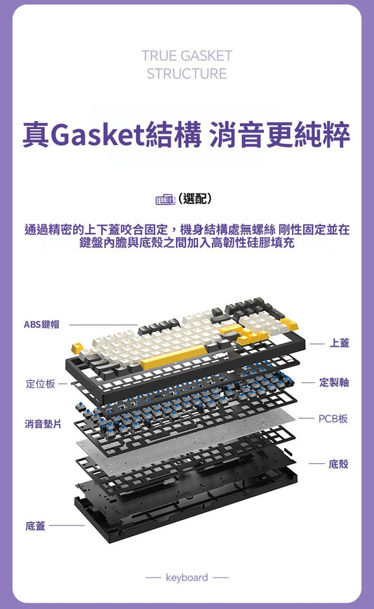 Technology M87 是一款三模無線藍牙機械鍵盤,也支持有線連接,具備 RGB 效果,採用 gasket 結構且支持熱插拔,可客製化,適用於遊戲場景