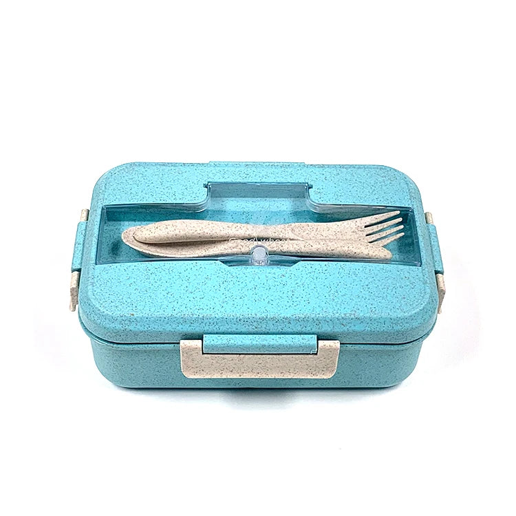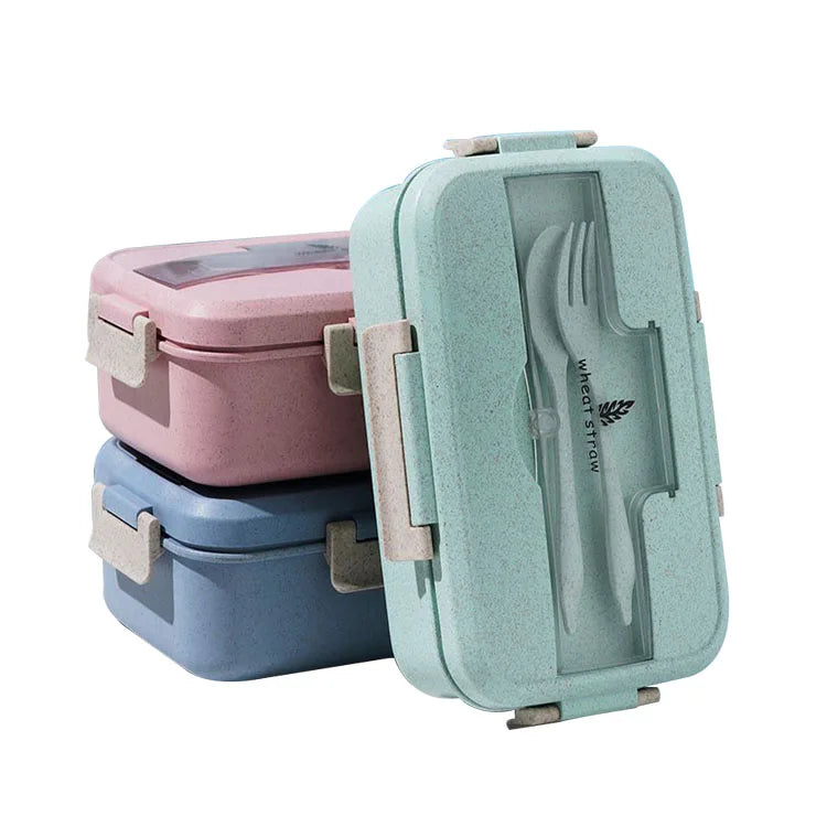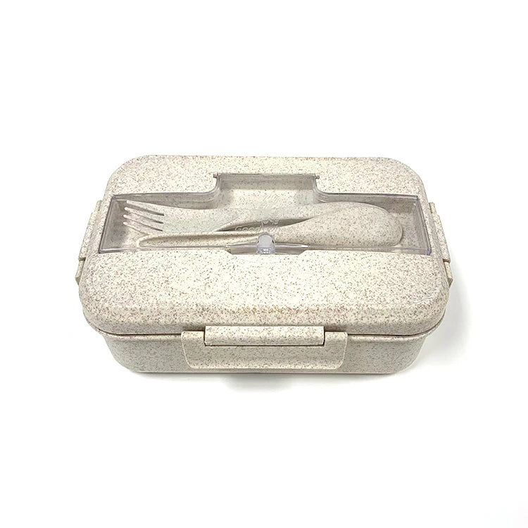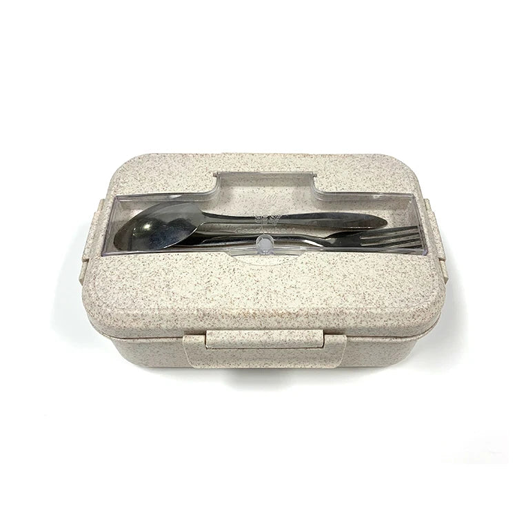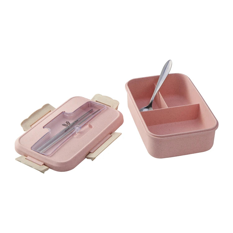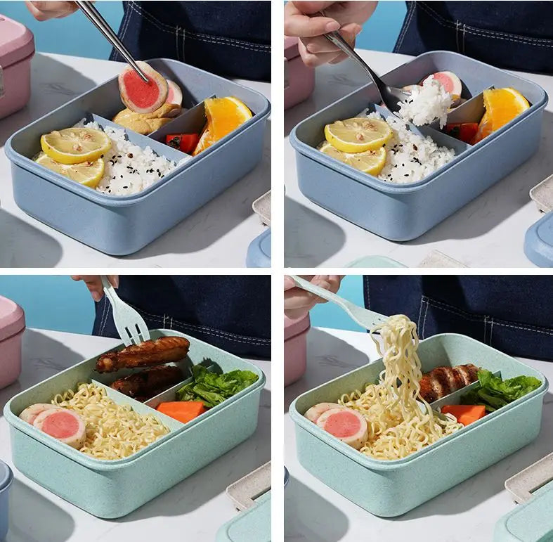 微波爐安全不鏽鋼便當盒 | 三格長方形食品容器 附小麥秸稈可加熱 PP 餐具