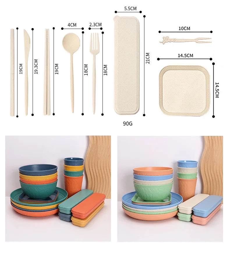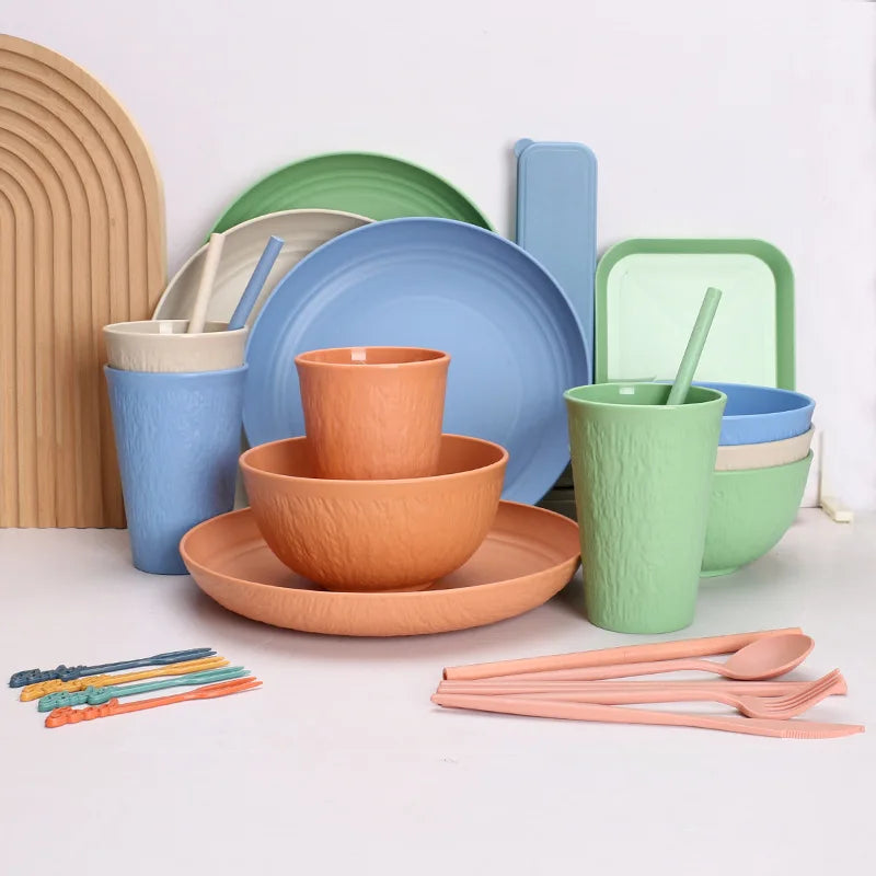核心材質與品質:全套採用小麥秸稈(wheat straw)製成,包含餐具本體與手柄,材質天然環保且符合食品接觸安全標準;搭配鏡面拋光工藝,表面光滑細緻,兼具質感與耐用性,長期使用不易磨損變形,實現「經久耐用」的使用體驗。