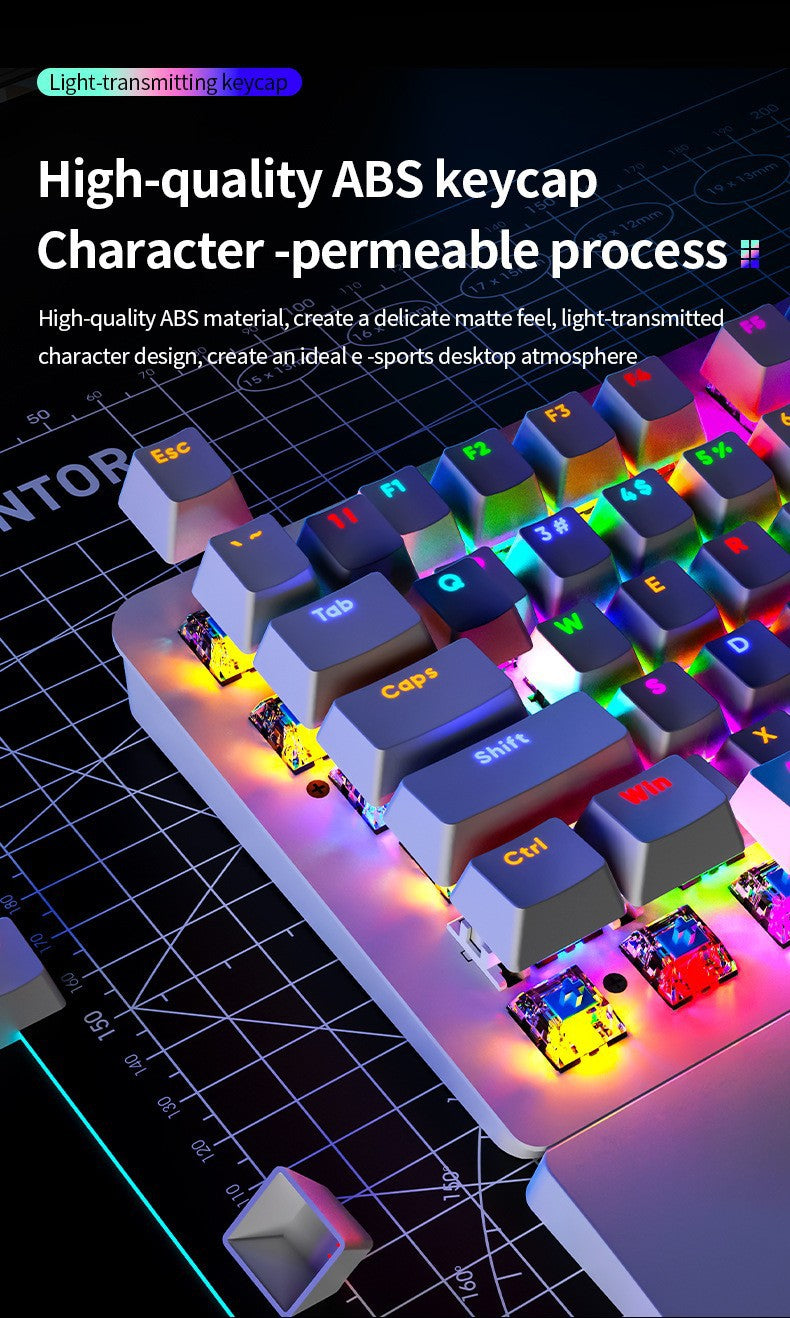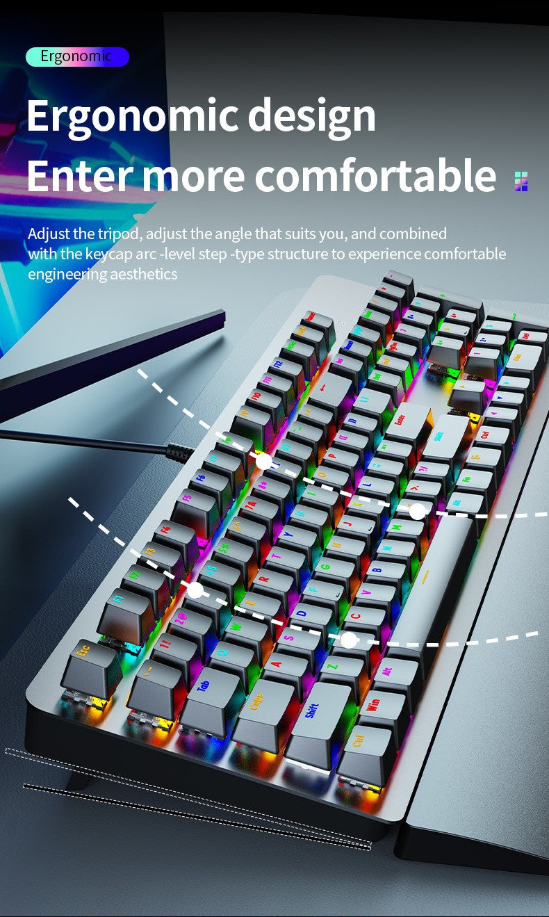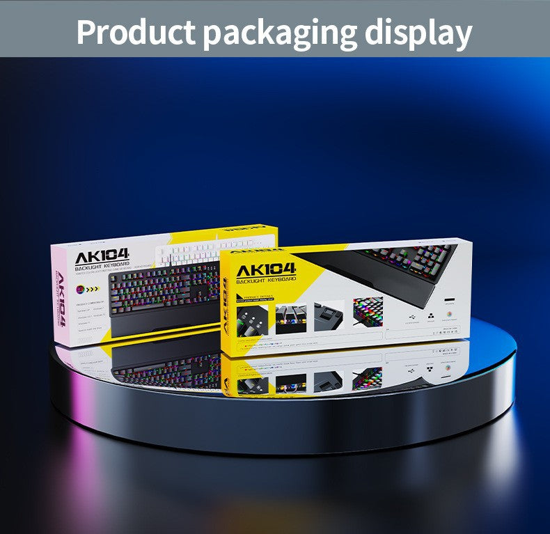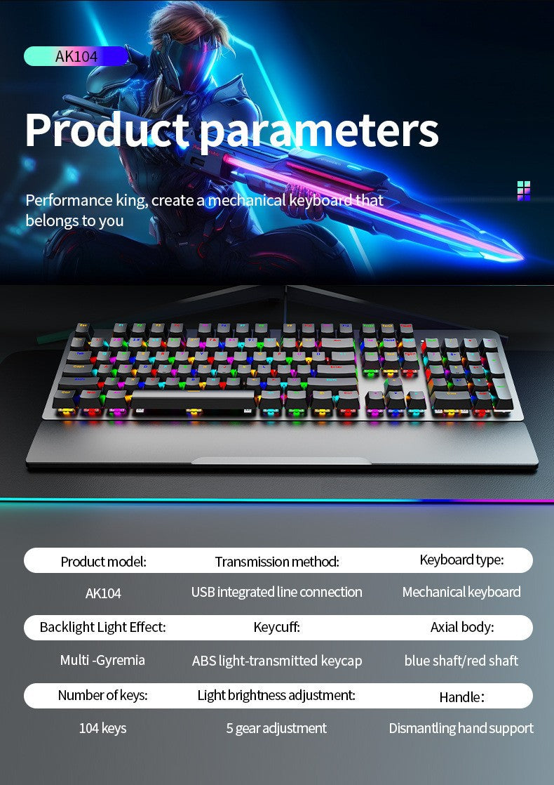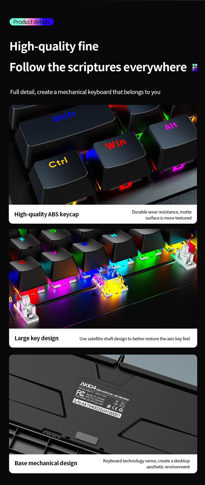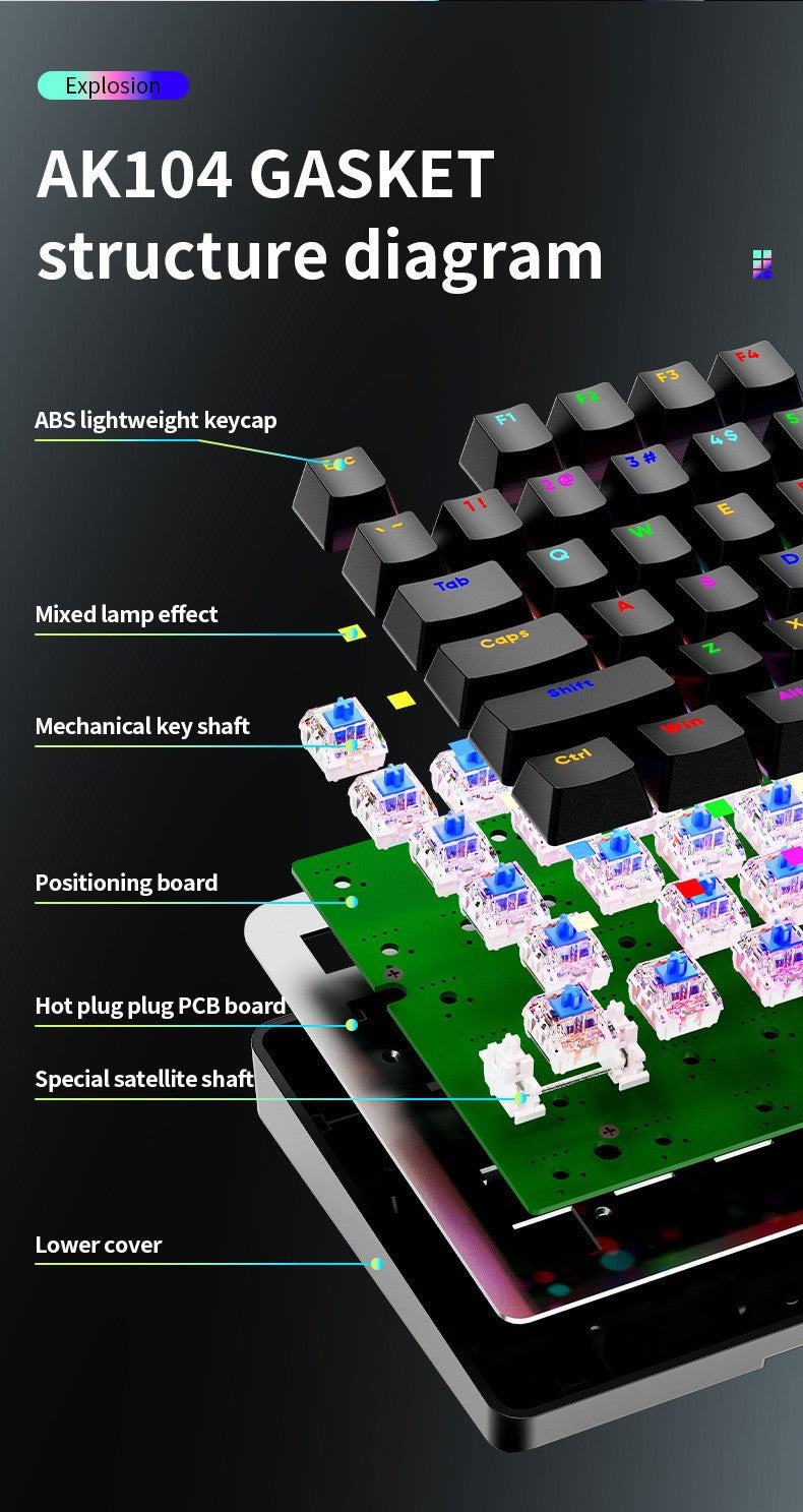 AK104 有線機械式鍵盤,可選配青軸、紅軸,具備 RGB 背光,適用於電競遊戲與辦公場景