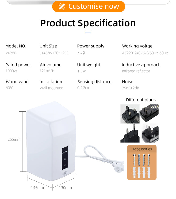 VX280 commercial wall-mounted fully automatic hand dryer contact-free high-speed fast drying hands-free electric induction hand dryer