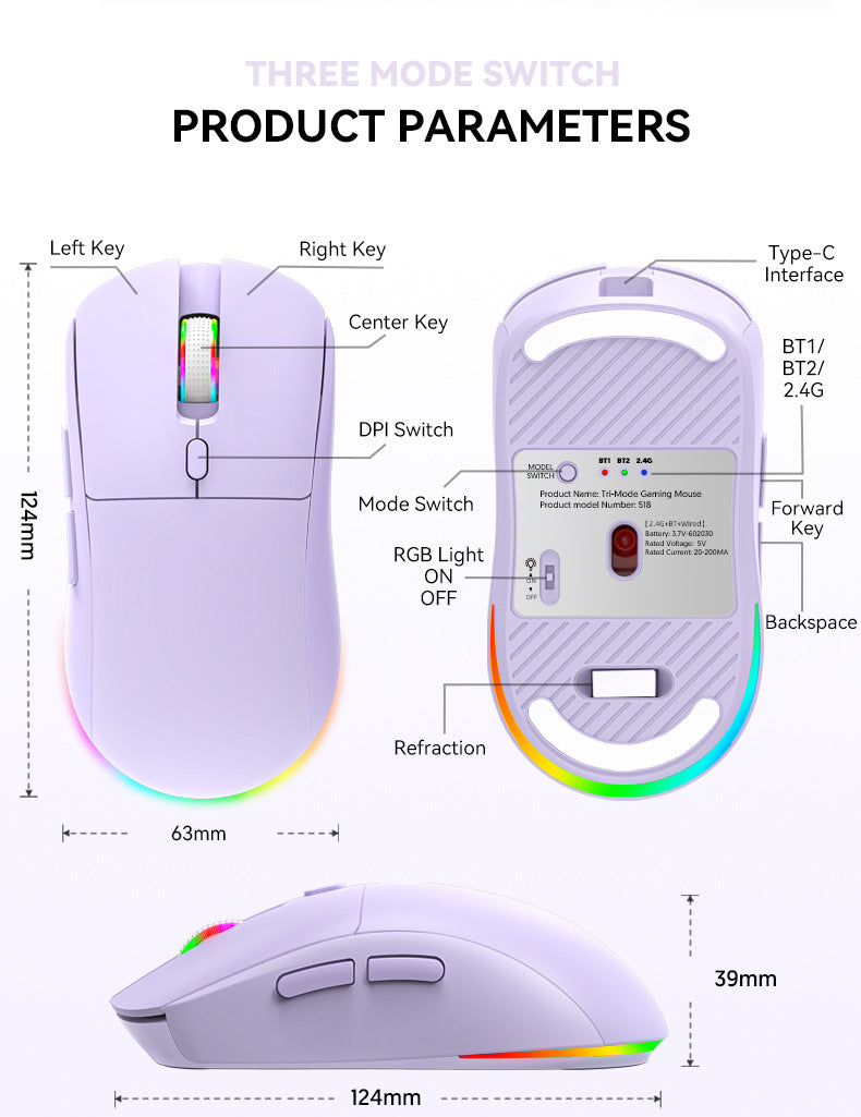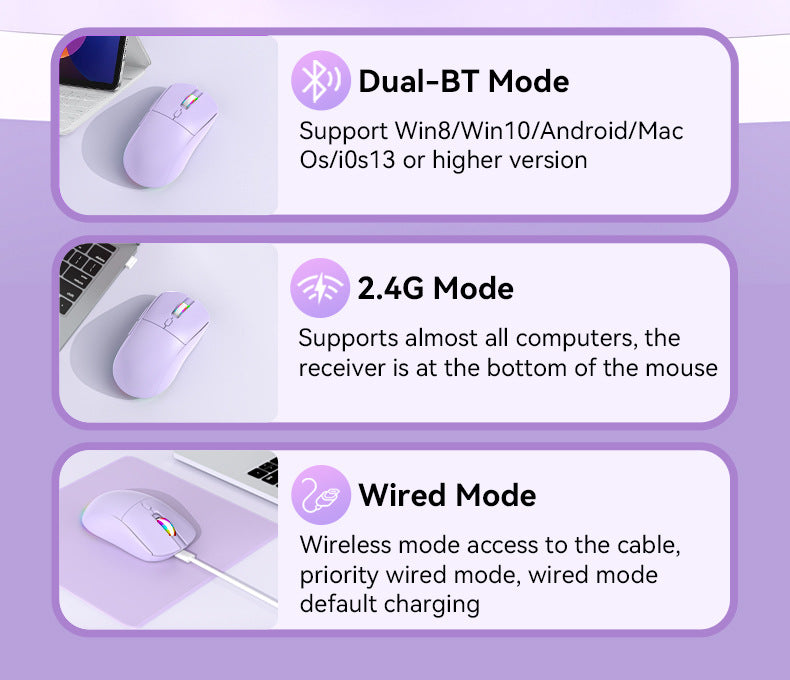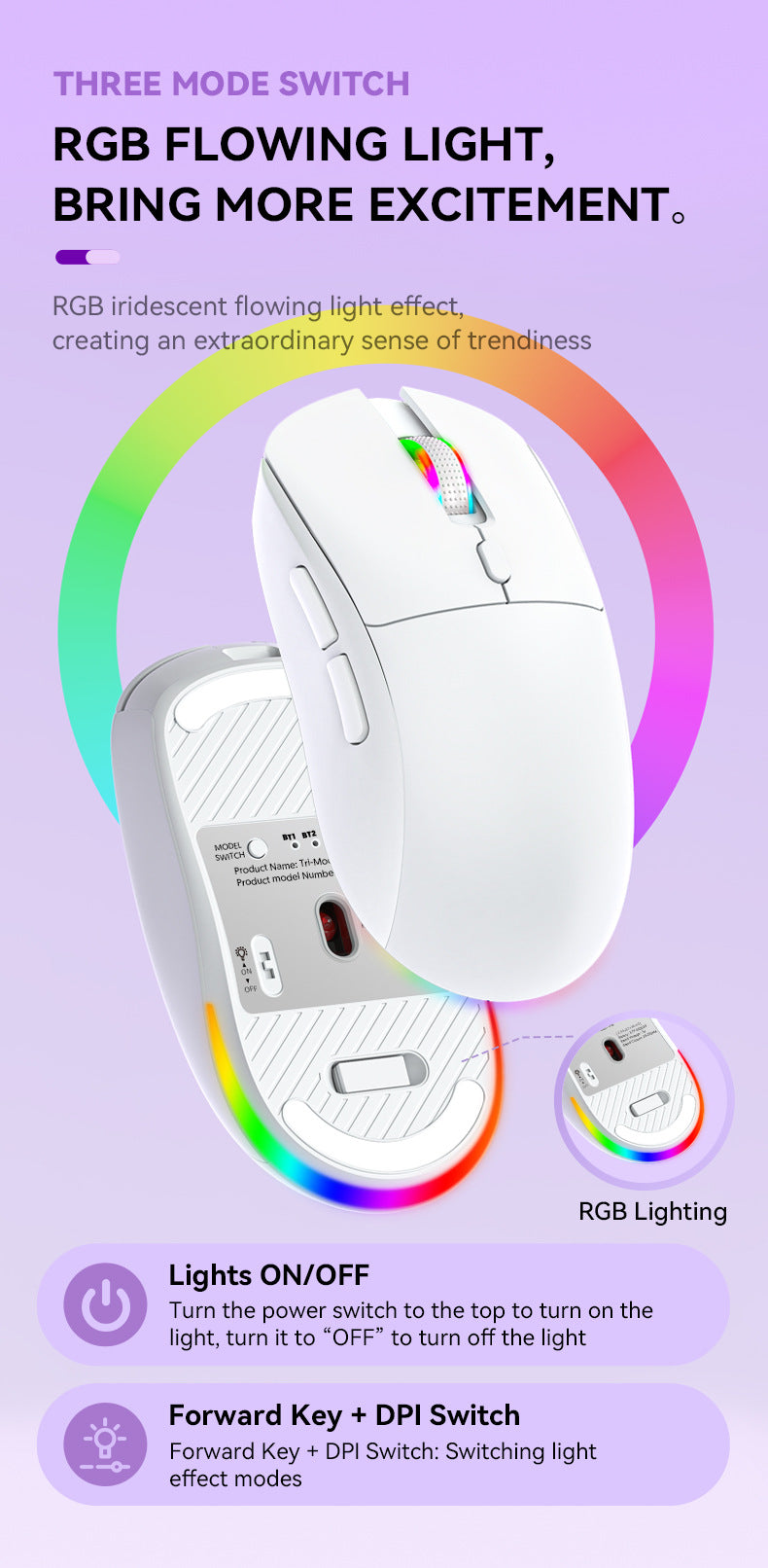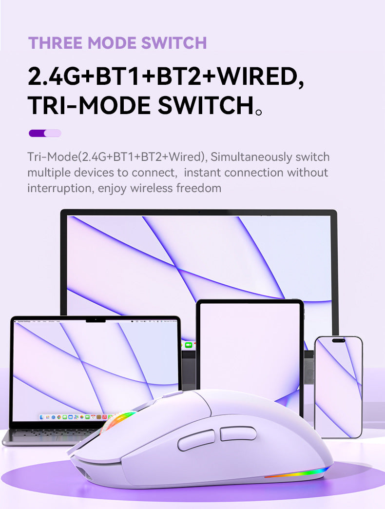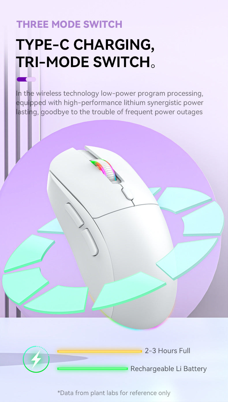 R518 無線藍牙三模遊戲滑鼠,支援 2.4g 無線、有線連接,具備無線充電功能,輕量設計,適用於電競與辦公場景